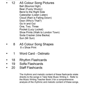 Designed to be used with Student & Teacher books, these all-inclusive kits contain classroom resources directly related to the Take Note Music Writing Workshops all laminated and magnetized. Rhythm Flashcards, Solfa Flashcards, Stave Flashcards and Song Pictures etc